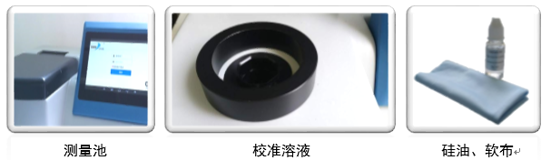 電源線、校準溶液(0.02 NTU,20.0NTU,100NTU,800NTU)、樣品瓶(3個、18ml)硅油(10ml)、軟布、使用說明書、保險管